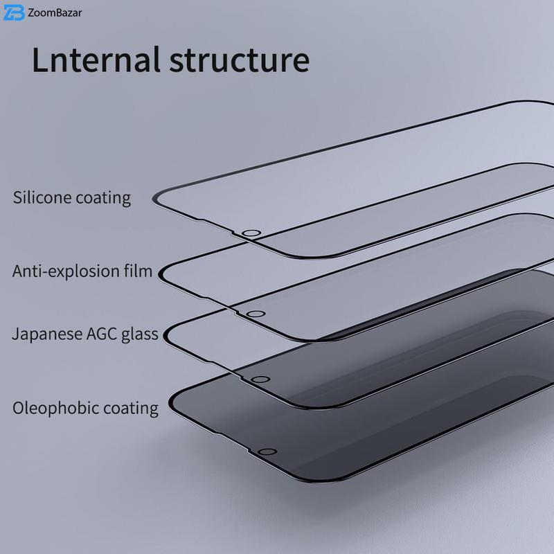 از حریم شخصی خود بهتر محافظت کنید.این روزها تمامی کارهای خود را با گوشی انجام میدهیم ، از انتقال پول گرفته تا رد و بدل کردن اطلاعات شخصی مختلف و یا چت کردن با دوستان صمیمی.احتمالا شما هم نمیخواهید حین انجام این کارها نگاه فرد غریبهای هم روی صفحهی گوشی شما باشد. با خرید این محافظ میتوانید به راحتی این مشکل را حل کنید و در مکانهای عمومی و شلوغ هم به راحتی به کارهای خود رسیدگی کنید. این گلس کاملا شفاف است. به هیچ وجه رنگ صفحه را تغییر نمیدهد و آن را تاریک جلوه نمیدهد.در کیفیت صفحه اختلالی مشاهده نمیکنید و مانند حالت بدون گلس خواهد بود.ابعاد خیلی دقیقی دارد.پوشش کاملی هم دارد و کل صفحهی گوشی را کاملا در بر میگیرد.زوایای دور صفحه، اندازهها و حتی انحنای ظریف کنارهها به دقت طراحی شده است تا این گلس بتواند کاملا فیت گوشی شده و مانند بخشی از آن به نظر برسد.ضخامت گلس تنها 0.3 میلیمتر است.همین ضخامت کم باعث میشود در عین دارا بودن مقاومت ، کیفیت صفحه را هم تحت تاثیر قرار ندهد و روی صفحه خیلی خوب بخوابد.این محافظ صفحه دارای پوششی از مواد چربی گریز و آب گریز است. این پوشش در واقع زاویه ی تماس آب و چربی با سطح را افزایش میدهد و سبب میشود قطرات آب و ذرات آلودگی روی آن جذب نشوند. در نهایت ظاهر صفحهی نمایش گوشی شما همواره تمیز و زیبا خواهد بود و مجبور نیستید مدام آن را تمیز کنید.تنها تا وقتی که حداکثر تا 30 درجه نسبت به صفحهی گوشی زاویه داشته باشید میتوانید آن را به خوبی ببینید. در زوایای بالاتر صفحه کاملا کدر و سیاه به نظر میرسد و چیزی قابل مشاهده نخواهد بود.چسبندگی بالایی دارد.از آنجایی که ابعاد دقیقی دارد نصب آن هم راحت است. دچار حباب نمیشود و به خوبی کل صفحه را پوشش میدهد.
