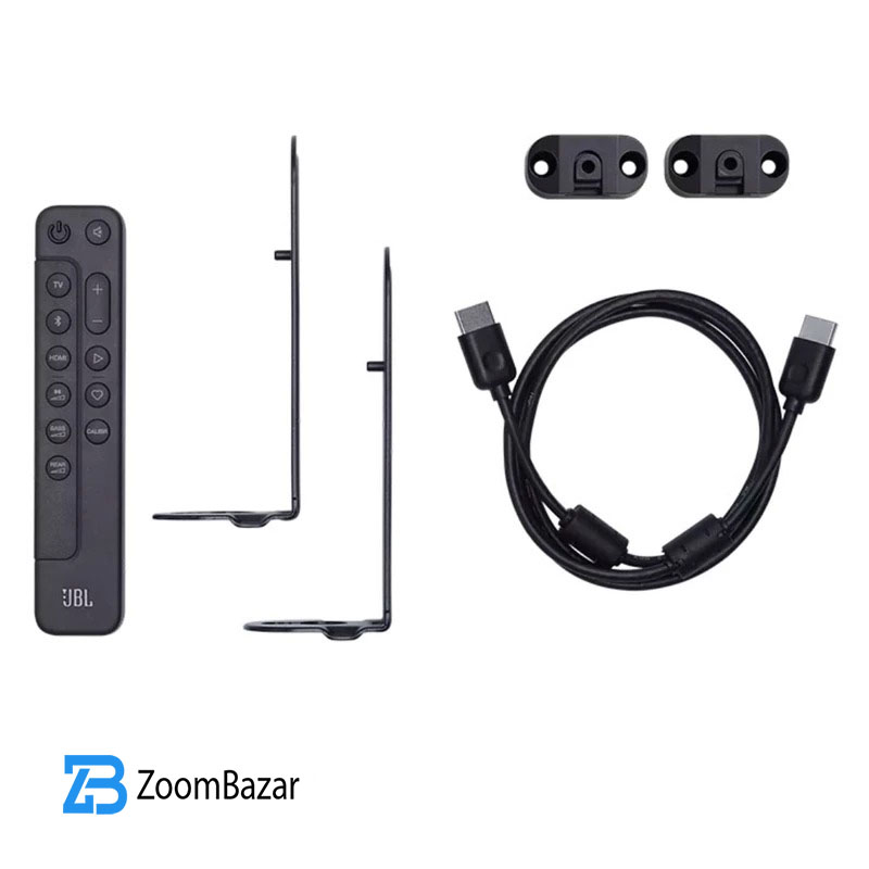 هنگامی که جعبه را باز می کنیم با ساندبار اصلی مواجه می شویم که در کنار دو اسپیکر و یک ساب ووفر بی سیم قرار دارد. علاوه بر اجزای اصلی bar 1300 یک کنترل از راه دور نیز در جعبه وجود دارد که به شما اجازه می دهد به راحتی تنظیمات ساندبار خود را تغییر دهند. کابل های لازم برای اتصال این ساندبار جی بی ال همراه آن برای شما ارسال می شود. یک کابل HDMI که تصویر و صدا را به خوبی منتقل می کند و کابل برق از جمله کابل های موجود در باکس است. همچنین با تعدادی براکت دیواری در شکل L و U نیز مواجه هستیم که برای اتصال آسان تر به دیوار به شما کمک می کنند.