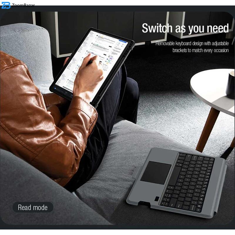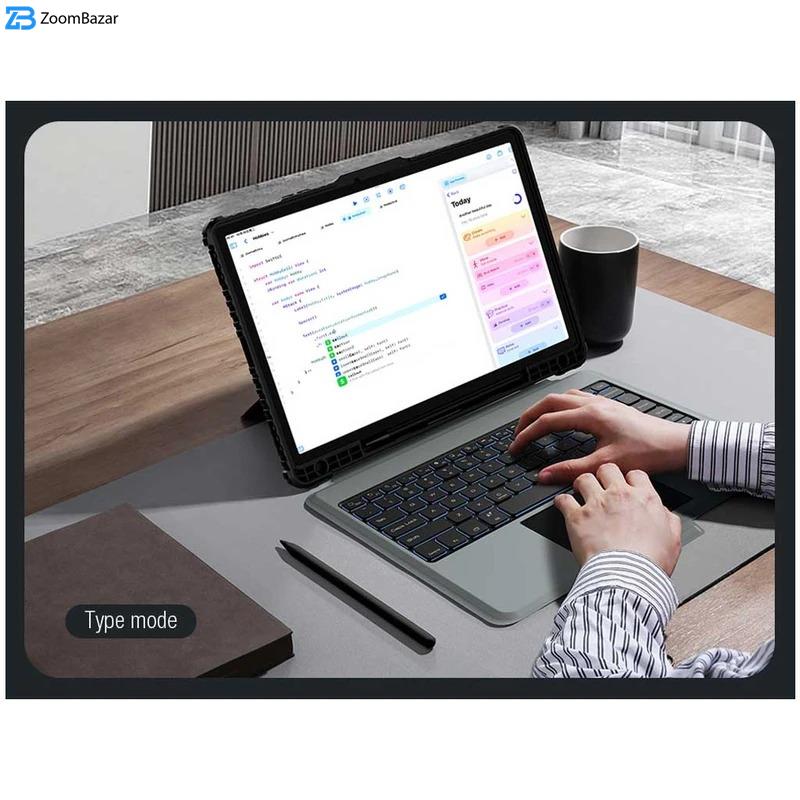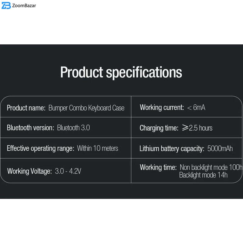 کیف کلاسوری نیلکین مدل Bumper Combo Backlit Keyboard جدیدترین نسخه Combo Keyboard اوایل سال 2024 می باشد که در مدل Backlit علاوه بر ویژگی های نسخه قبلی ویژگی نور پس زمینه در کیبورد با 7 رنگ متفاوت به آن اضافه شده که دیگر در فضای کم نور و یا شب به راحتی میتوانید از کیبورد استفاده کنید و دیگر دغدغه نور هنگام تایپ کردن را نداشته باشید.جنس این کاور ازTPUوPCساخته شده که دارای مقاومت بالایی می باشد.این کیف کلاسوری دارای محافظ دوربین بوده که به صورت کشویی عمل میکند.یکی از قابلیت های مفید در قاب تبلت ها داشتن استند است؛چون این دستگاه ها ابعاد بزرگی دارند و نگهداری از آن‌ها روی استند بسیار راحت تر و کم خطر تر است.از همین رو کیف کلاسوری دارای یک استند تاشو است که استحکام کافی برای نگهداشتن و استفاده از تبلت را خواهد داشت.شما می توانید حالت های مختلفی برای قرار گرفتن تبلت انتخاب کنید.این استند قابلیت تنظیم زاویه بین 100 تا 180 درجه را دارد.این محصول نیلکین دارای یک کیبورد قابل جدا شدن می باش .شما در صورت نیاز می توانید از این کیبورد استفاده کرده و یا آن را جدا کنید.کلیدهای این کیبورد به گونه‌ای(قطره‌ای)طراحی شده که قالب انگشتان شما باشد.این کلیدها بسیار بی صدا بوده و وزن پایینی دارد؛بعلاوه کار با آن شما را خسته نمی‌کند.کلیدهای کیبورد کیف کلاسوری بسیار حساس بوده و با کمترین فشار عمل خواهد کرد.بر روی این کیبورد یک پد لمسی وجود دارد که می توانید از آن به جای موس استفاده کنید.شما می توانید از طریق بلوتوث این کیبورد را به دستگاه خود متصل کنید.نرخ نمونه برداری لمسی پد لمسی آن120هرتز بوده که بسیار حساس بوده و از چند لمس همزمان پشتیبانی می کند.این کیبورد دارای یک باتری5000میلی آمپر ساعتی بوده که برای پر شدن آن نیاز به حدود 3 ساعت شارژ بوده و با پر بودن شارژ در حالت بدون نور تا100 ساعت می توانید از آن استفاده کنید؛ و در حالت نوری تا 14 ساعت. قابل ذکر است نسخه بلوتوث این کیبورد3.0می باشد و محدوده عملکرد آن حدود10متر است.در قسمت جلویی این قاب، جای برای قرار گرفتن قلم هوشمند اپل تعبیه شده که می توانید قلم خود را در این قسمت ها قرار دهید. با قرار گرفتن قلم در قسمت جلویی تعبیه شده در تبلت، می توانید قلم خود را به صورت وایرلس شارژ کنید.