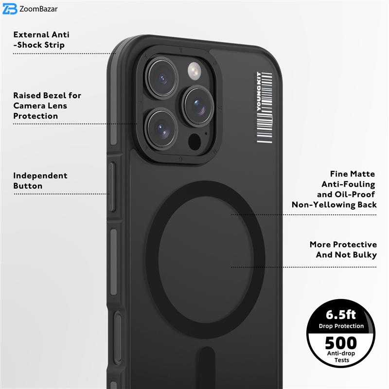 این محصول از جنس TPU باکیفیت و مقاوم در برابر ضربه می باشد . چهارگوشه قاب با کپسولهای هوا جهت جلوگیری از هرگونه ضربه محافظت می شود . لبه های برآمده محافظت بیشتری از صفحه نمایش در برابر هرگونه شکستگی و خط و خش ایجاد میکند . همچنین برآمدگی محافظ لنز دوربین آن را در ایمنی کامل قرار می دهد . طراحی دکمه ها آنچنان دقیق است که کار با گوشی را برای کاربر آسان کرده است . به لطف برش لیزری دسترسی به پورتهای گوشی برای کاربر آسان می باشد . این محصول با کیفیت بالا و با استفاده از تکنولوژی IMD ( چاپ دولایه ) نه تنها در برابر خط و خش مقوام است بلکه در مقابل سایش هم مقوام می باشد و همچنین رنگ محصول ثابت می باشد . مگ سیف این محصول با فناوری مکش مغناطیسی قوی و استاندارد خیال شما را از شارژ با مگ سیف راحت می کند . برند یانگ کیت (YOUNGKIT) مبتکر در طرحهای جدید و مینیمال شما را یک قدم از بقیه جلوتر نگه می دارد .