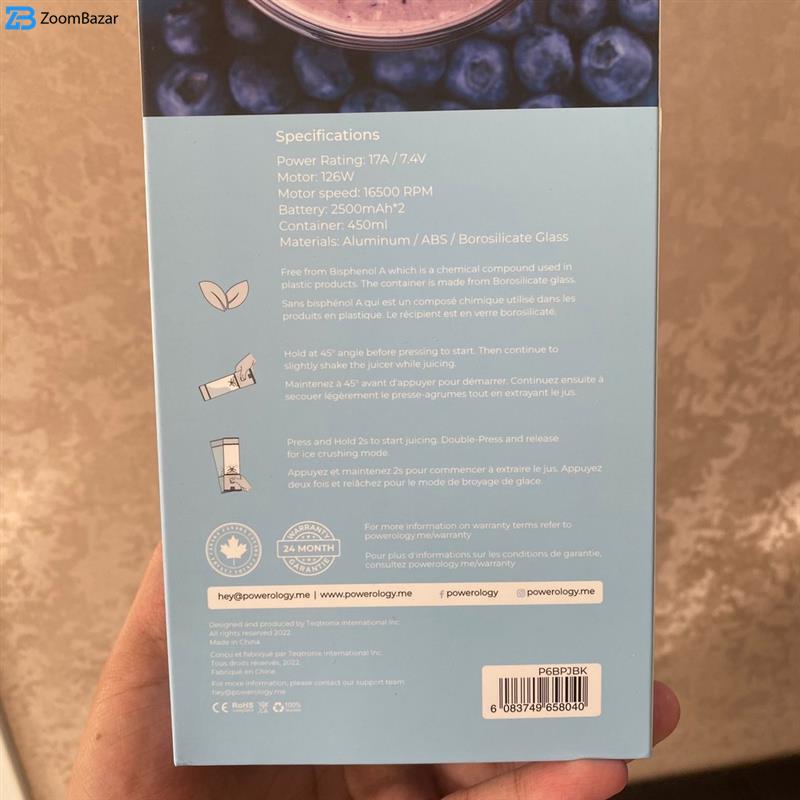 شیکر پاورولوجی مدل شارژی 126W Portable گنجایش 0.45 لیتر با تیغه 6 جهته استنلس استیل است که با استفاده از موتور 126 وات که در این محصول قرارداده شده میتواند به راحتی یخ را بدون استفاده از مایعات برای شما خرده کند و شما می توانید تمامی اسموتی ها، شیک ها و نوشیدنی های بر پایه یخ و حتی دانه های سخت مانند دانه فلفل سیاه یا زنجبیل یا جوز هندی و … با این محصول درست کنید. این محصول از دو باتری لیتیوم پلیمر 2500 میلی آمپر استفاده میکند که در مجموع 5000 میلی آمپر قابلیت ذخیره سازی انرژی دارد و با هر بار شارژ شما می توانید 15 الی 20 بار از این محصول استفاده کنید. دور موتور این محصول 16500 دور بر دقیقه است که تیغه استیل ضد زنگ این مخلوط کن شارژی را با سرعت بالایی به حرکت در می آورد تا تمام محتوای داخل مخزن شیشهای این شیکر را به خوبی مخلوط کرده و یک مخلوط یک دست و نرم را برای شما به ارمغان بیاورد.