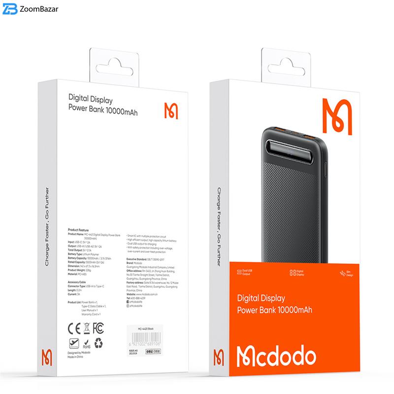 پاوربانک مک دودو MC-442 مجهز به نمایشگر دیجیتال LED است که وضعیت باتری را با دقت نمایش می‌دهد. این ویژگی به شما امکان می‌دهد تا همیشه از میزان شارژ باقی‌مانده مطلع باشید و بدانید چه زمانی باید پاوربانک را دوباره شارژ کنید. این نمایشگر با طراحی شفاف و نرم، علاوه بر کارایی، جلوه‌ای زیبا به پاوربانک می‌بخشد.