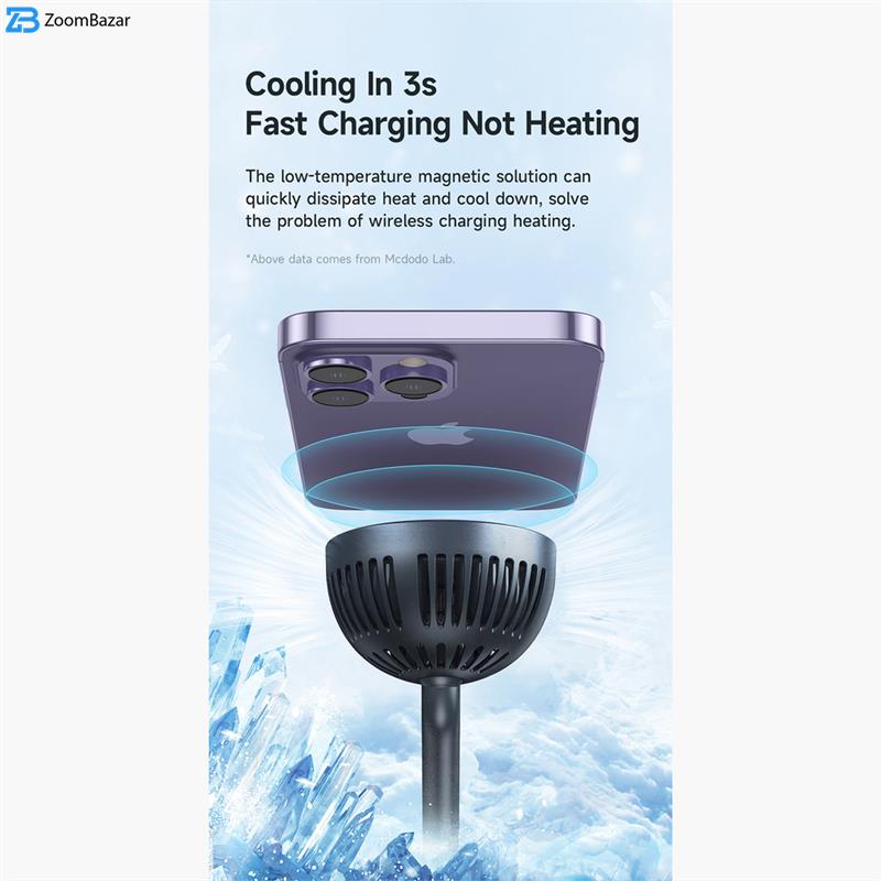 • سایر توضیحات توان خروجی 15 وات: این شارژر از پروتکل‌های شارژ سریع مانند PD و QC پشتیبانی می‌کند و امکان شارژ سریع انواع دستگاه‌های اپل و اندرویدی را فراهم می‌کند. پایه مغناطیسی با قدرت بالا: قابلیت مغناطیسی 3300Gs تضمین می‌کند که دستگاه شما با اطمینان و ثبات کامل بر روی شارژر قرار می‌گیرد. سیستم خنک‌کننده دوگانه: با TEC و توربو سایکلون، دمای دستگاه شما در حین شارژ به‌سرعت کاهش می‌یابد و از داغ شدن جلوگیری می‌شود.