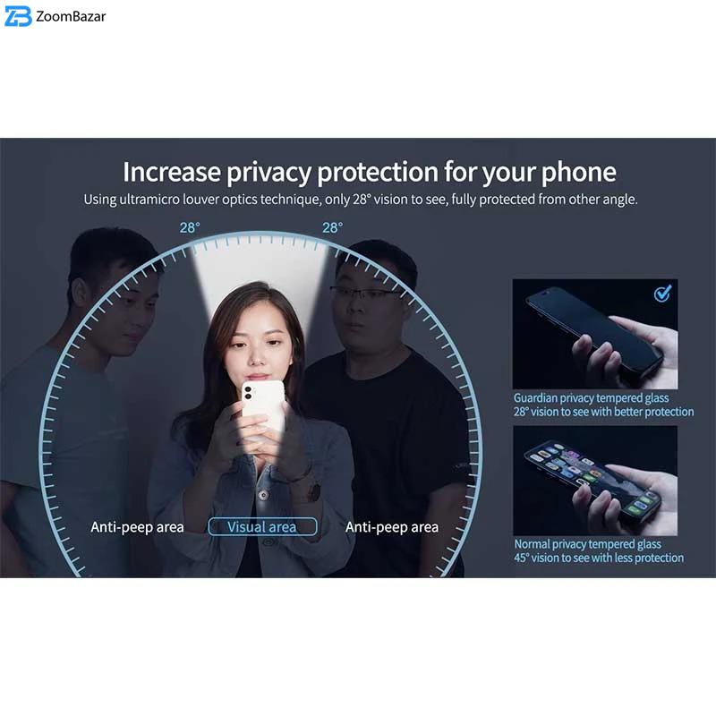 هر انتظاری که از یک گلس خوب و کاربردی دارید.این گلس نه تنها نهایت محافظت را از صفحه نمایش گوشی شما به عمل میآورد،بلکه ویژگیهای خیلی بیشتری هم دارد.حتما برای شما هم پیش آمده که در یک محیط عمومی مثل اتوبوس و مترو در حال کار با گوشی باشید و متوجه شوید فرد یا افرادی در حال نگاه کردن به صفحه گوشی شما هستند.فارغ از حس ناخوشایندگی که به شما دست میدهد،این کار از نظر امنیتی هم میتواند مشکلاتی به وجود بیاورد.ممکن است پسورد یا رمزهای مهمتان به راحتی فاش شوند و اطلاعات خصوصی شما در اختیار افراد غریبه قرار بگیرد.با خرید محافظ صفحه نمایش حریم شخصی نیلکین مدلGuardianمیتوانید از بروز چنین مسائلی جلوگیری کنید.با گذاشتن این گلس کسی جز خودتان صفحه گوشی را نمیبیند و میتوانید با خیال راحت با آن کار کنید.یک پوشش ضد درخشش و مات کننده روی سطح قرار گرفته است. این پوشش باعث میشود نور آفتاب از روی سطح بازتاب نکند و در محیطهای پر نور هم بتوانید به راحتی نمایشگر را ببینید.محافظ صفحه نمایش حریم شخصی نیلکین مدلGuardianدارای سطحی چربی گریز است.در نتیجه اثر انگشت،چربی و لکهها را به خود جذب نمیکند.خیلی دیر کثیف میشود. حتی اگر هم کثیف شود خیلی راحت و با کمترین زحمتی تمیز شده و شفاف میشود.ضخامت کمی در حد33میلیمتر دارد.این ضخامت کم باعث میشود حساسیت لمسی تخریب نشود و تاخیری در کار گوشی حس نکنید.با استفاده از این محافظ صفحه،دیدن صفحه نمایشگر گوشی فقط برای کسی که روبروی گوشی باشد ممکن است.در واقع، تا 28 درجه از طرفین صفحه دیده میشود.در زوایای بالاتر تنها یک صفحه تار و مات مشاهده میشود.محافظ صفحه نمایش حریم شخصی نیلکین مدلGuardianدارای سختی9Hاست که بیشترین درجه برای محافظ صفحه به شمار میرود.این سختی بالا موجب شده خط و خش روی آن نیفتد و مقاومت بسیار بالایی داشته باشد.این گلس پوشش سراسری دارد.هم لبهها و هم قسمتهای مرکز صفحه و گوشهها به طور کامل پوشش داده میشوند و هیچ مشکلی از نظر کار کردن با گوشی نخواهید داشت.جنس اصلی محافظ صفحه نمایش حریم شخصی نیلکین مدلGuardianاز شیشه حرارت دیده یا شیشه عملیات حرارتی شده است.ماندگاری و دوام بسیار بالایی دارد. میتوانید از این گلس در طولانی مدت استفاده کنید.کاملا شفاف است و صفحه را کدر نمیکند. کیفیت نمایشگر را تغییر نمیدهد.