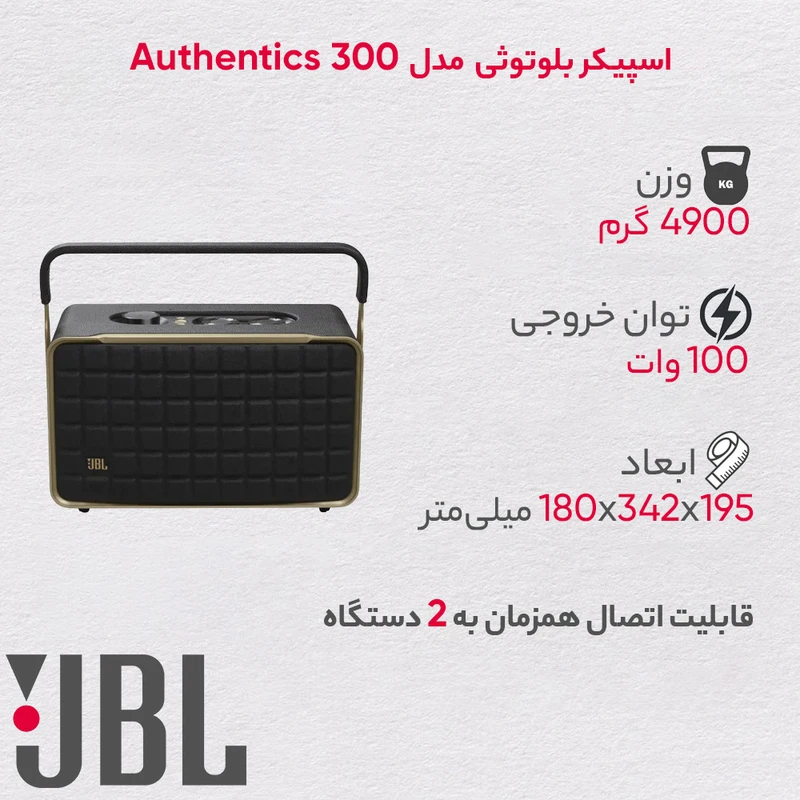 سبک و کیفیت صدای برتر که همراه با یکدیگر عالی می‌پیوندند. در هر مکان از یک پارچه سازی با سیستم عامل سبک لذت ببرید، صدای فوق‌العاده و دو دستیار صوتی داخلی خود را در هر نقطه از خانه خود تجربه کنید. با بارپوش چرم صنعتی، دستگیره فلزی مناسب و باتری شارژ‌شونده این بلندگوی JBL Authentics 300، می‌توانید موسیقی خود را همراه خود ببرید. طراحی کلاسیک متاثر از دهه 70 با گریل آیکونیک Quadrex آن اظهاریه ای مهم را در هرجای که قرار دارد ارائه می‌دهد. همچنین با صدای وسیع، باس عمیق و صدای اوجی شفاف، بیانیه‌ای مهمی ایجاد می‌کند. با دسترسی همزمان به Google Assistant و Amazon Alexa ، شما می‌توانید موسیقی مورد علاقه خود را پخش کنید، دستگاه‌های خانه هوشمند خود را کنترل کنید و موارد بیشتری را با صدای خود به صورت بی‌دست استفاده کنید.