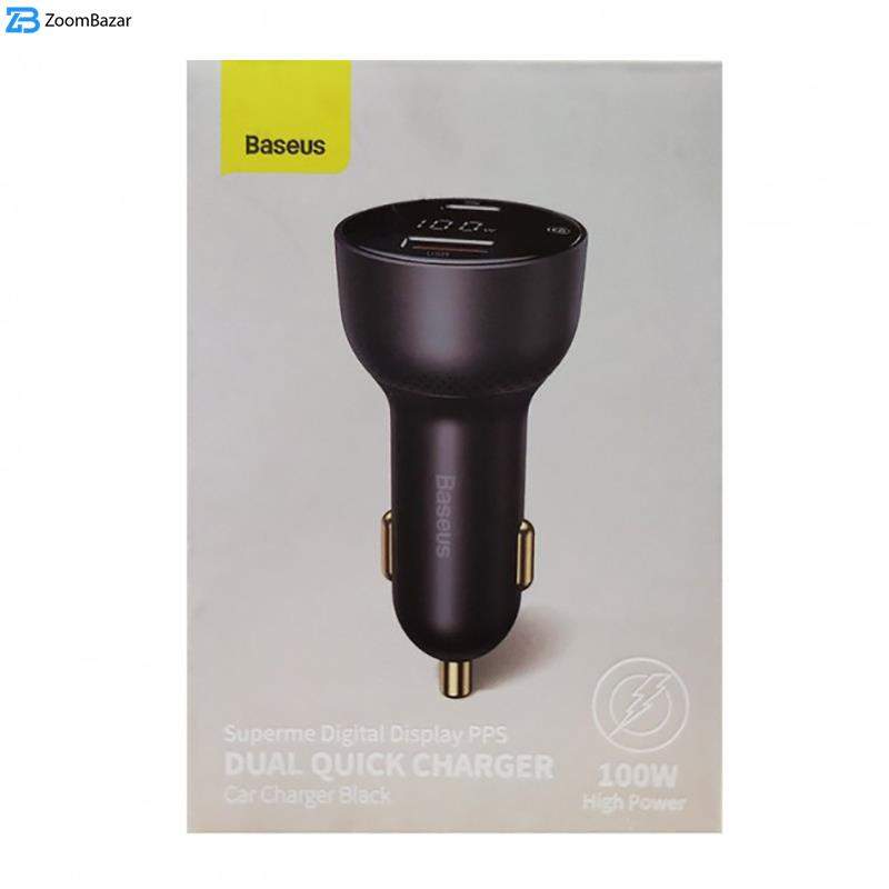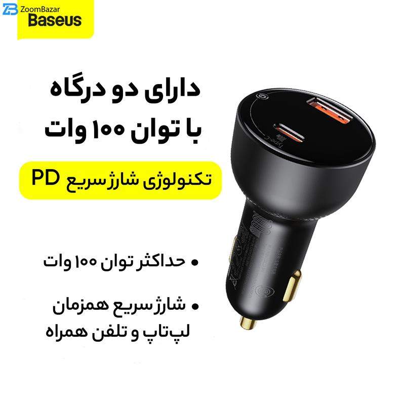 شارژر فندکی باسئوس دارای یک پورت USB و یک پورت Type-c برای شارژ همزمان دو دستگاه با حداکثر توان خروجی 100 واتی است که از تکنولوژی شارژ سریع PD پشتیبانی می کند.