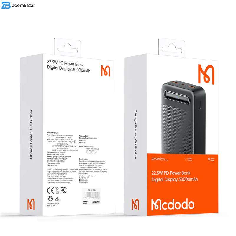 پاوربانک مک دودو 22.5W مدل MC-391 ظرفیت 30000 میلی آمپر ساعت با توان 22.5 وات دارای قابلیت فست شارژ آیفون و اندرویدی است و امکان شارژ 3 دستگاه همزمان را دارد.دارای 3 خروجی که 2 پورت USB و یک پورت تایپ سی که هم امکان شارژ خود پاوربانک را دارد و هم شارژ موبایل و تبلت.این پاوربانک از پروتکل های شارژ سریع PD/QC/SCP/FCP/AFC/VOOC/Apple را دارد و با انواع برندها سازگار است.زمان شارژ این پاوربانک با شارژر 25/33W تایپ سی PD و کابل تایپ سی توان بالا حدود 7.5 ساعت خواهد بود.طراحی بسیار شیک و مینیمال و لاکچری از ویژگی های این پاوربانک است.انتقال حرارت بسیار عالی و عدم تجمع حرارت نیز از خصوصیات MC-391 است.این پاوربانک با رنگهای سفید،سرمه ای و مشکی عرضه شده که با کدهای MC-3910/MC-3911/MC-3912 تفکیک می گردند.پاوربانک داراي تراشهای هوشمندی است که با 9 قابلیت محافظتی ، محافظت کامل از دستگاه در برابر اتصال کوتاه ، نوسانات آمپر و ولتاژ و نوسان حرارت بعهده داشته و میزان جریان و ولتاژ لازم برای هر دستگاه را بصورت اتومات و سريع تشخيص میدهد.دارای صفحه دیجیتال نشانگر درصد شارژ پاوربانک است.دارای ابعاد 15.3cmx6.73cmx4.1cm است.