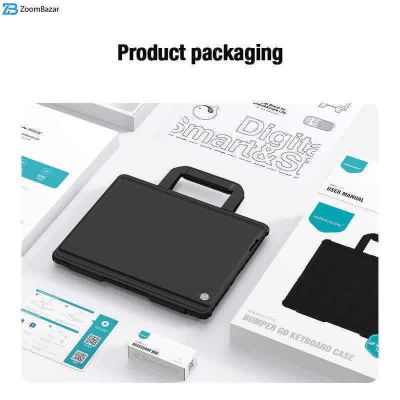 کیف کلاسوری نیلکین مدلBumper Go Keyboard یک کیف محافظ و مقاوم است که دارای یک کیبورد با کیفیت نیز میباشد که با استفاده از آن می توانید به کارهای روزمره بپردازید. تفاوت این مدل با Bumper معمولی دسته ی محکم بالای کیف است که حمل آن را آسان تر میکند. این کیف کلاسوری دور تا دور بدنه دستگاه را میپوشاند.این کیف دارای مقاومت بالای بوده و در برابر ضربه مقاوم است.البته به این معنی نبوده که در برابر ضربات شدید نیز مقاوم است.جنس این کاور ازTPUوPCساخته شده که دارای مقاومت بالایی می باشد.این کیف کلاسوری دارای محافظ دوربین بوده که به صورت کشویی عمل میکند.یکی از قابلیت های مفید در قاب تبلت ها داشتن استند است؛چون این دستگاه ها ابعاد بزرگی دارند و نگهداری از آنها روی استند بسیار راحت تر و کم خطر تر است.از همین رو کیف کلاسوری دارای یک استند تاشو است که استحکام کافی برای نگهداشتن و استفاده از تبلت را خواهد داشت.شما می توانید حالت های مختلفی برای قرار گرفتن تبلت انتخاب کنید.این محصول نیلکین دارای یک کیبورد یا صفحه کلید قابل جدا شدن می باشد.شما در صورت نیاز می توانید از این کیبورد استفاده کرده و یا آن را جدا کنید.کلیدهای این کیبورد به گونهای(قطرهای)طراحی شده که قالب انگشتان شما باشد.این کلیدها بسیار بی صدا بوده و وزن پایینی دارد؛بعلاوه کار با آن شما را خسته نمیکند.کلیدهای کیبورد کیف کلاسوری بسیار حساس بوده و با کمترین فشار عمل خواهد کرد.بر روی این کیبورد یک پد لمسی وجود دارد که می توانید از آن به جای موس استفاده کنید.شما می توانید از طریق بلوتوث این کیبورد را به دستگاه خود متصل کنید.نرخ نمونه برداری لمسی پد لمسی آن120هرتز بوده که بسیار حساس بوده و از چند لمس همزمان پشتیبانی می کند.این کیبورد دارای یک باتری150میلی آمپر ساعتی بوده که برای پر شدن آن نیاز به حدود1.5تا2ساعت شارژ بوده و با پر بودن شارژ تا30روز می توانید از آن استفاده کنید؛البته این عدد برای روزی2ساعت کار با کیبورد است که متناسب با استفاده شما متغییر خواهد شد.قابل ذکر است نسخه بلوتوث این کیبورد3.0می باشد و محدوده عملکرد آن حدود10متر است.در قسمت جلویی این قاب، جای برای قرار گرفتن قلم هوشمند اپل تعبیه شده که می توانید قلم خود را در این قسمت ها قرار دهید.