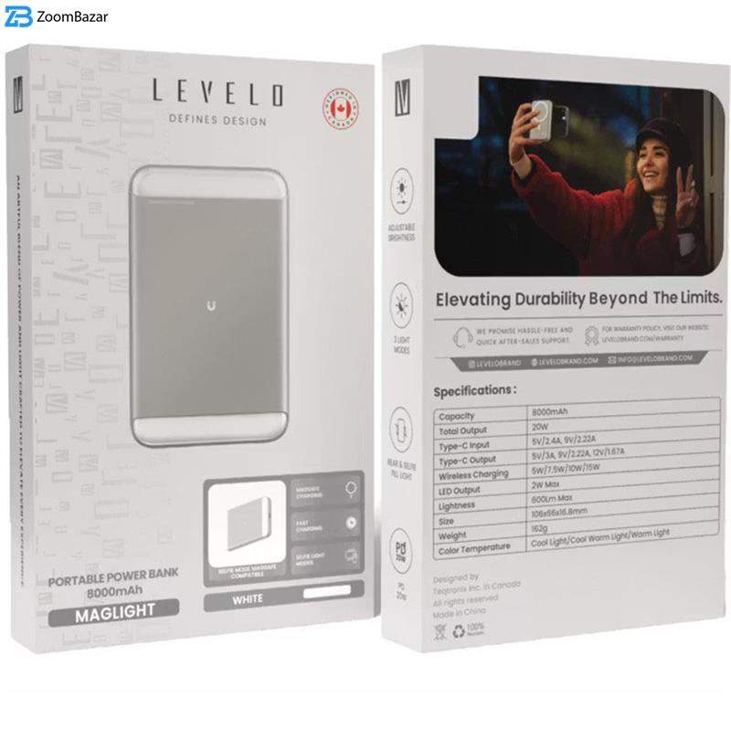 پاوربانک قابل حمل Levelo MagLight یک راهکار خلاقانه و چند منظوره برای رفع نیازهای شارژ و نورپردازی در حین حرکت ارائه میدهد. امکان شارژ سریع با توان ۲۰ وات، تمام دستگاه های شما را به طور کارآمد شارژ میکند، در حالی که این پاوربانک ۸۰۰۰ میلی آمپر ساعتی از خروجی های Type-C با تنظیمات ۵ ولت/۳ آمپر، ۹ ولت/۲.۲۲ آمپر و ۱۲ ولت/۱.۶۷ آمپر پشتیبانی میکند. سازگاری با فناوری MagSafe امکان شارژ بیسیم تا ۵ وات، ۷.۵ وات، ۱۰ وات یا ۱۵ وات را فراهم میکند. این دستگاه همچنین مجهز به یک چراغ LED با حداکثر توان ۲ وات و نوردهی ۶۰۰ لومن است. سه حالت نور متفاوت در آن وجود دارد: نور سرد، نور ترکیبی سرد-گرم و نور گرم. تمام این حالات امکان تنظیم میزان روشنایی را بر اساس نیاز کاربر فراهم میکنند، چه برای سلفی و چه برای نورپردازی محیطی. طراحی جمع و جور و چند کاربرده آن، این پاوربانک را به یک نور سلفی یا نور پس زمینه تبدیل میکند که برای عکاسی، کمپینگ یا استفاده روزمره ایدئال است. Levelo MagLight سهولت استفاده، قدرت شارژ و نورپردازی را در یک محصول واحد ترکیب کرده است.