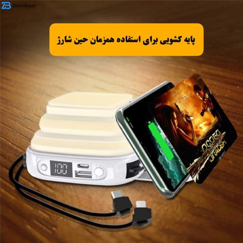 این پاوربانک دارای 3 عدد خروجی Lightening و USB-A و USB-C است و دو عدد کابل تایپ سی و لایتنیگ است.