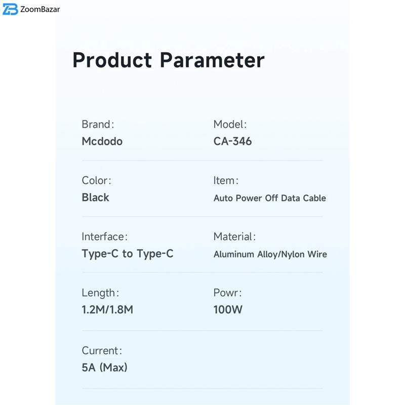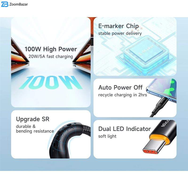 کابل تایپ سی به تایپ سی، دارای سیستم خاموش شدن خودکار، توان 100 وات، ساخته شده از متریال مرغوب و مقاوم در برابر آسیب، دارای نور LED دوگانه، دارای IC خاموش کننده خودکار، دارای قابلیت انتقال داده