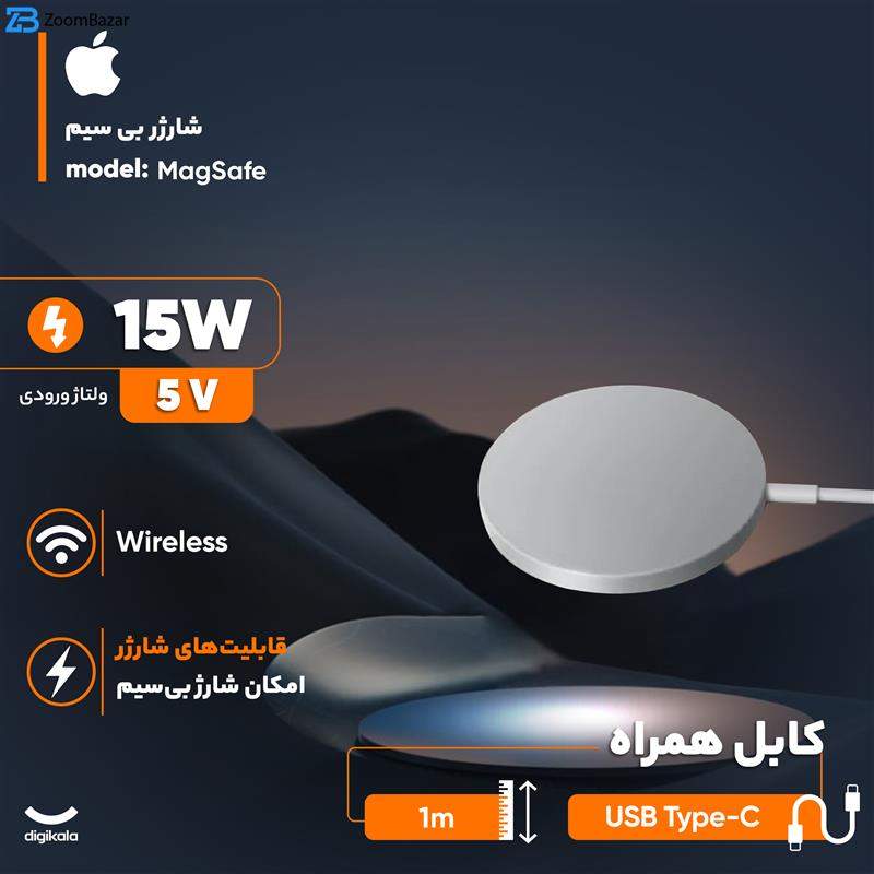 با استفاده از شارژر بی سیم می‌توان گوشی یا تبلت خود را به آسانی و سرعت بیشتری شارژ کرد. برند اپل جزو محبوب‌ترین برند‌های جهان است و استفاده از محصولات و گوشی‌های اپل امروزه بسیار متداول است. استفاده از اکسسوری‌های اپل با توجه به طراحی زیبا و کیفیت بالا مورد توجه بسیاری از کاربران و طرفداران این برند است. شارژر بی سیم اپل مدل MagSafe محصولی با کیفیت و طراحی زیبا از این برند است. با استفاده از این محصول می‌توان گوشی یا تبلت اپل را با سرعت بالاتری شارژ کرد. به همراه این شارژر بی‌سیم یک کابل USB-C جهت وصل شدن آن به سری شارژر ارائه می‌شود. MagSafe به گونه‌ای طراحی شده که با اتصال آن به سری شارژر گوشی خود دقیقا همان ولتاژ و آمپر خروجی سری شارژر را به گوشی شما می‌رساند. این محصول حدودا 82 گرم وزن دارد که با گوشی‌های آیفون 8 به بالا سازگار است.