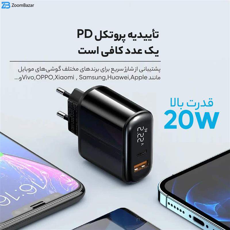 یکی از ویژگی‌های برجسته این آداپتور، توان خروجی 20 واتی آن است که به راحتی قابلیت شارژ سریع دستگاه‌هایی مانند گوشی‌های