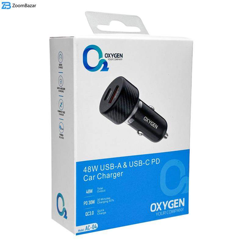 شارژر فندکی اکسیژن مدل AC-04 یکی از محصولات با کیفیت و کاربردی در حوزه لوازم جانبی خودرو است که با طراحی جمع‌وجور، بدنه‌ای مقاوم و قابلیت شارژ سریع، گزینه‌ای مناسب برای افرادی است که زمان زیادی را در خودرو سپری می‌کنند و نیاز به شارژ سریع و ایمن دستگاه‌های الکترونیکی خود دارند.این شارژر از بدنه‌ای فلزی و مستحکم با روکش آلومینیومی بهره می‌برد که علاوه‌بر زیبایی، در برابر حرارت و ضربه نیز مقاومت بالایی دارد. نصب آن بسیار ساده بوده و تنها با قرار دادن در محل فندک خودرو قابل استفاده است، بدون نیاز به هیچ‌گونه ابزار اضافی.از نظر فنی، این شارژر به دو خروجی مجزا مجهز شده است؛ یکی درگاه USB-A با قابلیت پشتیبانی از فناوری QC3.0 که توان خروجی ۱۸ وات را ارائه می‌دهد، و دیگری درگاه USB-C با فناوری Power Delivery (PD) که تا ۳۰ وات توان را تأمین می‌کند. مجموع توان خروجی این شارژر ۴۸ وات است که امکان شارژ هم‌زمان دو دستگاه با سرعت بالا را فراهم می‌سازد.شارژر فندکی اکسیژن مدل AC-04 با ولتاژ ورودی ۱۲ تا ۲۴ ولت طراحی شده و از این‌رو هم برای خودروهای سواری و هم خودروهای سنگین مانند کامیون‌ها قابل استفاده است. این دستگاه با اغلب گوشی‌های هوشمند، تبلت‌ها، پاوربانک‌ها و سایر دستگاه‌های دیجیتال سازگار بوده و با داشتن مدارهای محافظتی، از دستگاه شما در برابر نوسانات برق، اتصال کوتاه، افزایش دما و شارژ بیش‌ازحد محافظت می‌کند
