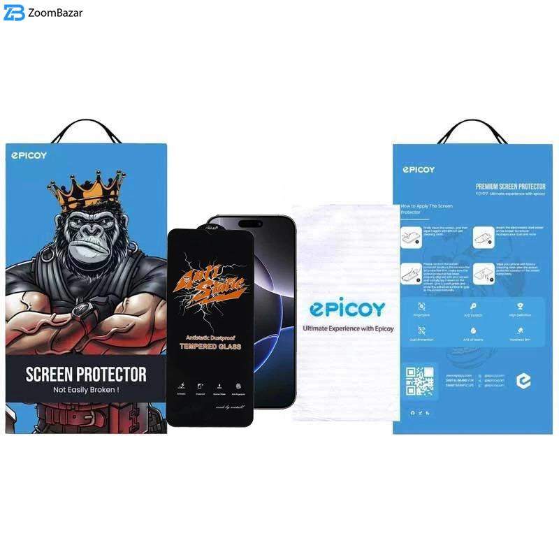در زمینه محافظ صفحه نمایش،شرکت اپیکوی گلس های مختلف و متنوع طراحی و ساخته است که یکی از مرغوب ترین و با کیفیت ترین گلس های این شرکت گلس Antistatic Dustproof می‌باشد که محبوبیت خاصی بین کاربران دارد. علت این امر مواد اولیه مرغوب، پوشش کامل صفحه نمایش، چسیندگی بسیار بالا و مهم تر از همه خاصیت آنتی استاتیک است که در ادامه توضیح داده می‌شود. گلس Antistatic Dustproof دارای لبه هایی با قوس 2.5D می‌باشد که این امر بسیار دارای اهمیت است. زیرا لبه های گلس دارای منحنی است و به دست یا وسایلی گیر نمیکند که باعث بلند شدن و یا شکستن محافظ صفحه نمایش شود. و همچنین ضخامت این گلس 0.3 میلیمتر میباشد که یکی از مهمترین موارد در طراحی گلس است. این محافظ صفحه نمایش دارای خاصیت آنتی استاتیک است. این ویژگی باعث می‌شود گرد و غبار جذب گلس نشود و به همین دلیل هم نصب خیلی راحتی داشته باشد. محافظ صفحه نمایش اپیکوی مدل Antistatic Dustproof دارای مقاومت بالا در برابر انواع ضربه های ناگهانی است. زیرا این گلس بسیار حرارت دیده و از سختی 9H برخوردار است. این گلس در برابر ضربه سه برابر از گلس های معمولی مقاومتر است. لبه های این محافظ صفحه نمایش به طور ویژه تری ساخته شده تا از شکستگی های لبه محافظ صفحه نمایش و LCD محافظت کند و از خرد شدگی جلوگیری میکند. در کنار داشتن کیفیت و وضوح HD این گلس باعث می‌شود به راحتی انگشت کاربر روی سطح گلس حرکت کند و هیچگونه مشکلی در این زمینه نداشته باشد. سطح محافظ صفحه نمایش اپیکوی مدل Antistatic Dustproof چربی گریز و آب گریز است. در نتیجه قطرات آب، لکه‌های چربی و آلودگی یا اثر انگشت روی آن جا نمی‌اندازند و ردشان باقی نمی‌ماند. همواره صفحه‌ای تمیز خواهید داشت که از کار با آن لذت می‌برید و یا در صورت ایجاد لکه با یک دستمال ساده کاملا به حالت اول و شفاف خود باز میگردد. این گلس طوری طراحی و ساخته شده که مانع از انعکاس نور در فضاهای باز و محیط های روشن است که باعث محافظت بیشتر از چشم کاربر میشود و از خستگی چشم جلوگیری می‌کند، هیچ گونه کاهشی بروی حساسیت تاچ نمایشگر گوشی کاربر ایجاد نمیشود و دارای قابلیت نصب اسان است.