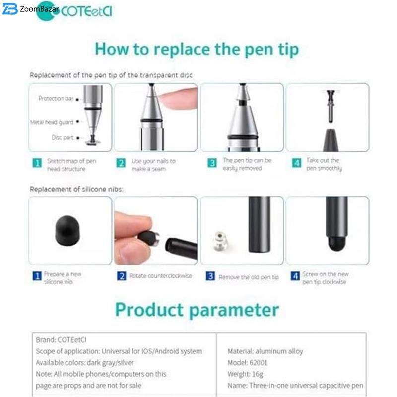 - سایر مشخصات دارای 3 سری (سری گرد سیلیکونی / سری تخت / خودکار)، بدون نیاز به شارژ، بدنه ساخته شده از آلیاژ آلومینیوم، 3 سری / قابلیت تعویض سری ها، سازگار با صفحه خازنی (اندروید / iOS / ویندوز)