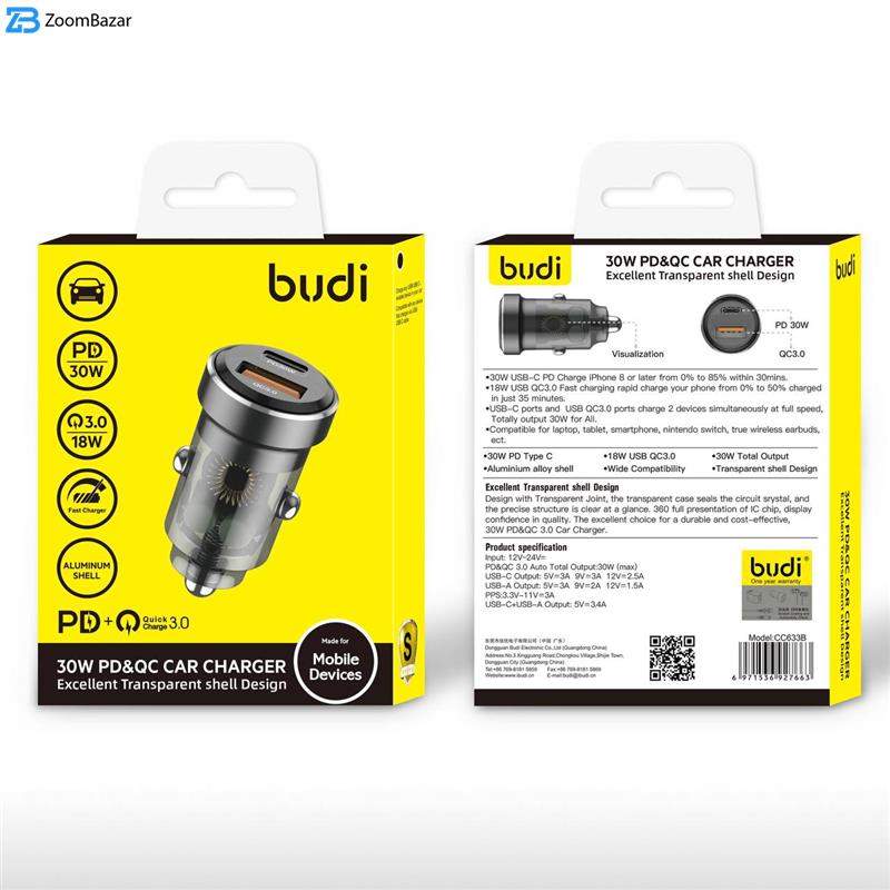 • توضیحات ‏BUDI 30W PD&QC Car Charger برند : Budi مدل : CC633 ورودی : 12V-24V خروجی : USB-C : 5V-3A ، USBA : 5V-3A ماکسیمم خروجی : 30W ‏ PD-30W ، QC-18W جنس بدنه : پلاستیک شفاف