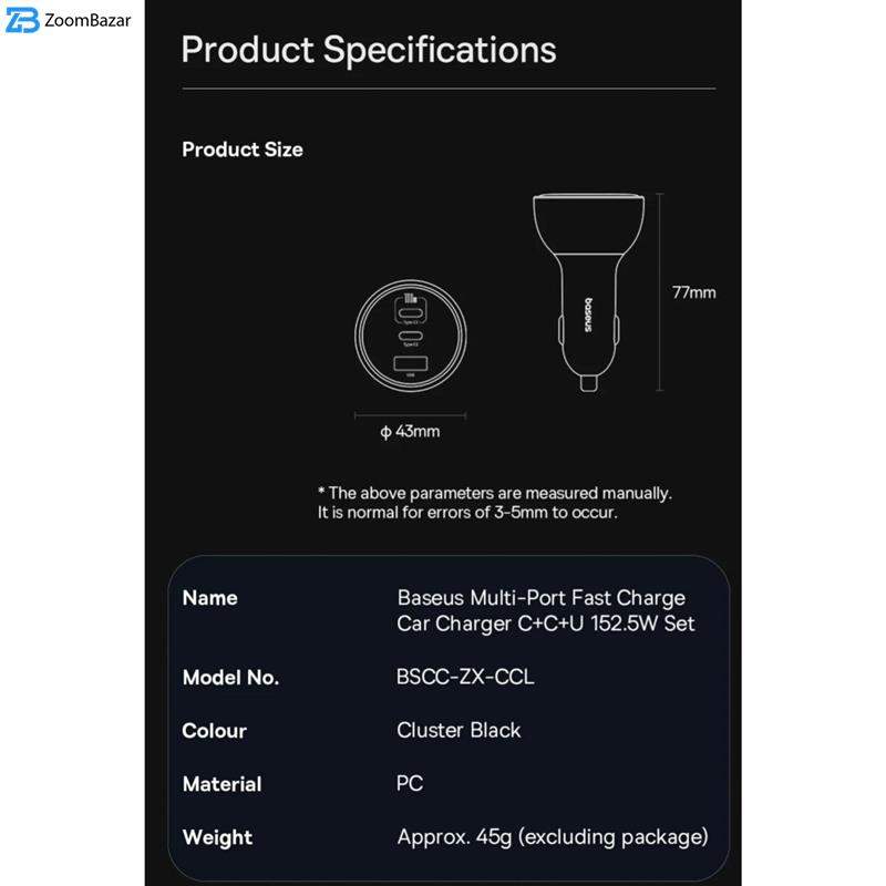 شارژر فندکی 152.5 وات Baseus BSCC-ZX-CCL یک راه حل شارژ قدرتمند و کارآمد است که برای شارژ سریع و همزمان چندین دستگاه در جاده طراحی شده است. با دو پورت USB-C و یک پورت USB-A، از پروتکل های شارژ سریع PD و QC پشتیبانی می کند و از تحویل سریع برق برای گوشی های هوشمند، تبلت ها، لپ تاپ ها و سایر ابزارها اطمینان حاصل می کند.