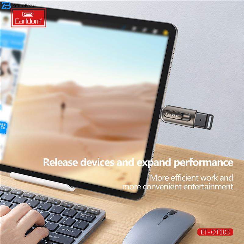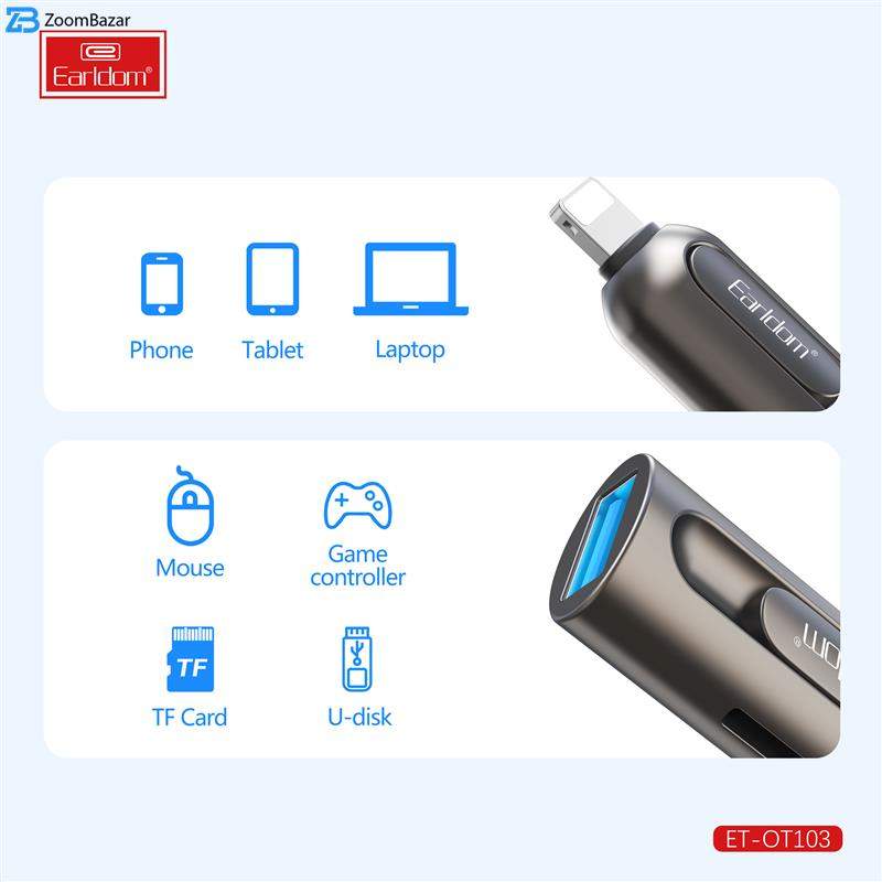 جا به جایی اطلاعات از گوشی به کارت حافظه و برعکس جزو کارهایی است که اغلب کاربران موبایل با آن روبرو هستند و برای انجام اینکار نیاز به یک رابط و مبدل است. ارلدام با طراحی و ساخت یک رابط او تی جی لایتنینگ که مخصوص کابران گوشی های آیفون و تبلت شرکت اپل است اینکار را آسان کرده است. مبدل او تی جی ارلدام مدل ET-OT103 ابعادی به اندازه یک فلش مموری دارد و به راحتی داخل جیب یا کیف پولتان جای می گیرد. جنس بدنه ی این محصول از آلیاژ آلومینیوم ساخته شده است و در برابر خوردگی و خراشیدگی بسیار مقاوم است. یک طرف این مبدل رابط لایتنینگ و طرف دیگر پورت USB است، روی بدنه این مبدل یک شیار کارت خوان TF نیز وجود دارد.همانطور که در بالا اشاره کردیم روی بدنه ی این او تی جی آیفون یک شیار کارت خوان وجود دارد که شما می توانید کارت حافظه را مستقیما روی آن قرار دهید و اطلاعات موجود روی مموری کارت را به گوشی آیفون و یا برعکس انتقال دهید. شما می توانید کانکتور لایتنینگ این مبدل را به گوشی آیفون، مک بوک و یا آیپد و از طرف دیگر دستگاه هایی مانند موس، گیم کنترلر، فلش مموری و غیره را متصل نمایید.