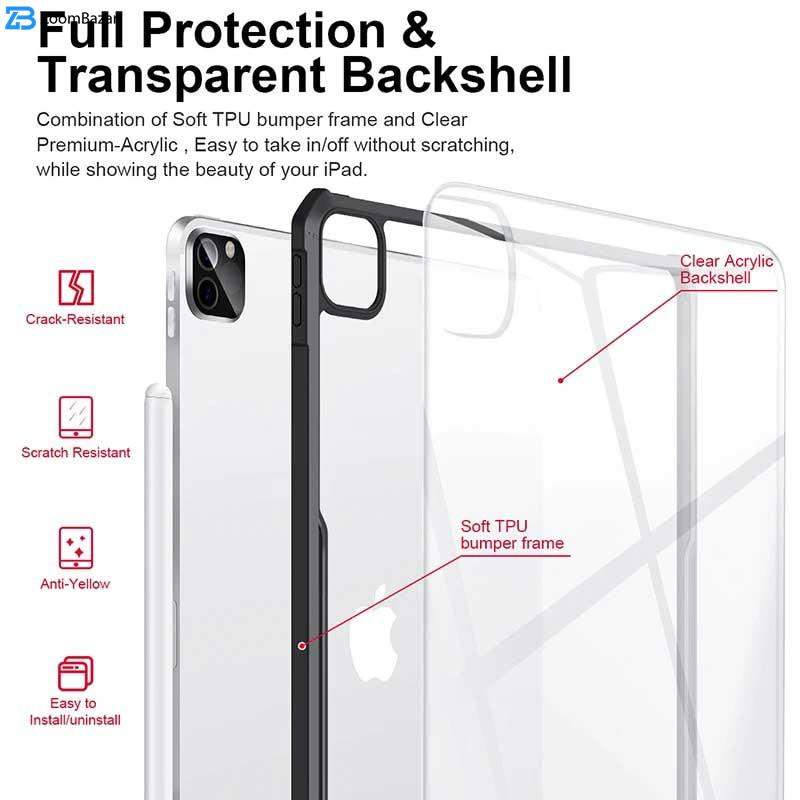 محافظت همیشگی از دستگاه های دیجیتال بخشی جدایی ناپذیر از نگه داری آنهاست که آیپد شما هم از این قاعده مستثناء نیست ، کاور ها باید ضمن حفظ زیبایی آیپد، از آن در برابر خطراتی مانند شوک و ضربه و به خصوص سقوط حفظ کنند. طبق تحقیقات میزان آسیب وارد شده از گوشه های آیپد ها بسیار زیاد است و اکثرا برخورد در گوشه های آیپد بیشتر است. اکثر ما دوست داریم ظاهر خودِ آیپد نیز درون کاور جلوه کند. در مجموع اگر کاوری باشد که طراحی منحصر به فرد آن ترکیبی از زیبایی کاور و خودِ آیپد را نمایان کند و همچنین محافظت ویژه ای از گوشه های آیپد کند قطعا بهترین انتخاب ما خواهد بود. کاور اپیکوی مدل Xundd Beatle همان کاوری است که تمامی این نیاز ها را برطرف میکند. ساخته شده از بهترین متریال اولیه یعنی PC شفاف و فشرده و در عین حال انعطاف پذیر و همچنین TPU که به دلیل خواص نرمی و محافظت بالا در برابر ضربه این کاور را به یک کاور بی نظیر تبدیل میکند. برای شفافیت و نمایش زیبایی آیپد از PC به شکل کریستال و کاملا شفاف در قسمت پشتی کاور استفاده شده است. همچنین خاصیت مقاومت بالا در برابر ضربه و خط و خش نیز به جذابیت آن می افزاید. در قسمت های کناری از TPU به شکلی عالی استفاده شده و برش های بسیار دقیق دیده میشود. این برش های دقیق دسترسی به درگاه ها را آسان کرده و قرار گیری دستگاه داخل کاور به بهترین شکل انجام میشود. انعطاف پذیری و نرمی آن ضربه را از دستگاه دور میکند و به آن انتقال نمیدهد. همچنین راحتی را در هنگام در دست داشتن آیپد در ساعات طولانی استفاده هدیه میکند. نکته بسیار قابل توجه در خصوص کاور اپیکوی مدل Xundd Beatle وجود بامپر هایی است که در 4 گوشه کاور آیپد به شکل برآمده و نرم قرار داده شده اند تا گوشی همراه شما در برابر سقوط آسیب ناپذیر شود. لبه های برجسته کاور کمک میکنند حتی در صورت عدم وجود گلس روی صفحه نمایش از تماس آن با سطح صاف جلوگیری میشود. البته که به شکلی استاندارد طراحی شده و گلس شمارا در صورت استاندارد بودن آن بلند نمیکند. اپیکوی محافظت از لنز دوربین آیپد شما را فراموش نکرده است، پوششی کامل برای لنز دوربین در نظر گرفته شده است، لنز ها به درستی جای خود قرار میگیرند و لبه به شکلی دقیق 0.8 میلی متر بر آمده شده و حفاظت را از دستگاه شما را تکمیل میکنند.