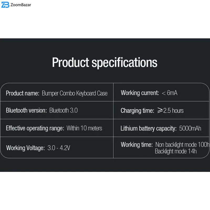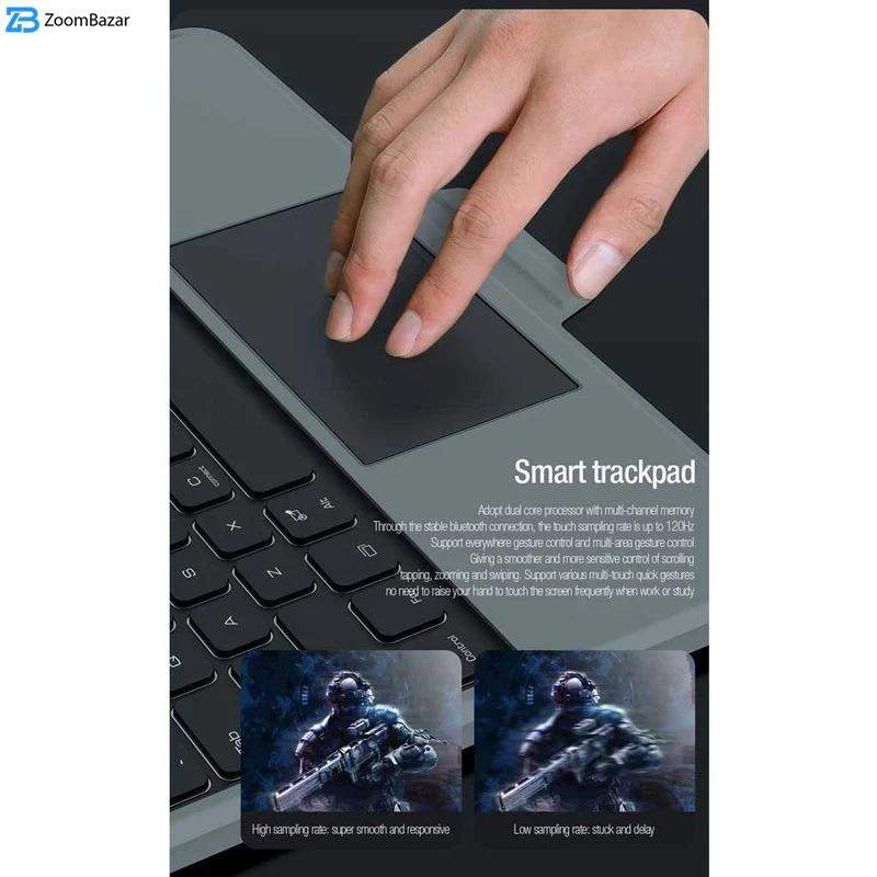 کیف کلاسوری نیلکین مدل Bumper Combo Backlit Keyboard جدیدترین نسخه Combo Keyboard اوایل سال 2024 می باشد که در مدل Backlit علاوه بر ویژگی های نسخه قبلی ویژگی نور پس زمینه در کیبورد با 7 رنگ متفاوت به آن اضافه شده که دیگر در فضای کم نور و یا شب به راحتی میتوانید از کیبورد استفاده کنید و دیگر دغدغه نور هنگام تایپ کردن را نداشته باشید.جنس این کاور ازTPUوPCساخته شده که دارای مقاومت بالایی می باشد.این کیف کلاسوری دارای محافظ دوربین بوده که به صورت کشویی عمل میکند.یکی از قابلیت های مفید در قاب تبلت ها داشتن استند است؛چون این دستگاه ها ابعاد بزرگی دارند و نگهداری از آن‌ها روی استند بسیار راحت تر و کم خطر تر است.از همین رو کیف کلاسوری دارای یک استند تاشو است که استحکام کافی برای نگهداشتن و استفاده از تبلت را خواهد داشت.شما می توانید حالت های مختلفی برای قرار گرفتن تبلت انتخاب کنید.این استند قابلیت تنظیم زاویه بین 100 تا 180 درجه را دارد.این محصول نیلکین دارای یک کیبورد قابل جدا شدن می باش .شما در صورت نیاز می توانید از این کیبورد استفاده کرده و یا آن را جدا کنید.کلیدهای این کیبورد به گونه‌ای(قطره‌ای)طراحی شده که قالب انگشتان شما باشد.این کلیدها بسیار بی صدا بوده و وزن پایینی دارد؛بعلاوه کار با آن شما را خسته نمی‌کند.کلیدهای کیبورد کیف کلاسوری بسیار حساس بوده و با کمترین فشار عمل خواهد کرد.بر روی این کیبورد یک پد لمسی وجود دارد که می توانید از آن به جای موس استفاده کنید.شما می توانید از طریق بلوتوث این کیبورد را به دستگاه خود متصل کنید.نرخ نمونه برداری لمسی پد لمسی آن120هرتز بوده که بسیار حساس بوده و از چند لمس همزمان پشتیبانی می کند.این کیبورد دارای یک باتری5000میلی آمپر ساعتی بوده که برای پر شدن آن نیاز به حدود 3 ساعت شارژ بوده و با پر بودن شارژ در حالت بدون نور تا100 ساعت می توانید از آن استفاده کنید؛ و در حالت نوری تا 14 ساعت. قابل ذکر است نسخه بلوتوث این کیبورد3.0می باشد و محدوده عملکرد آن حدود10متر است.در قسمت جلویی این قاب، جای برای قرار گرفتن قلم هوشمند اپل تعبیه شده که می توانید قلم خود را در این قسمت ها قرار دهید. با قرار گرفتن قلم در قسمت جلویی تعبیه شده در تبلت، می توانید قلم خود را به صورت وایرلس شارژ کنید.