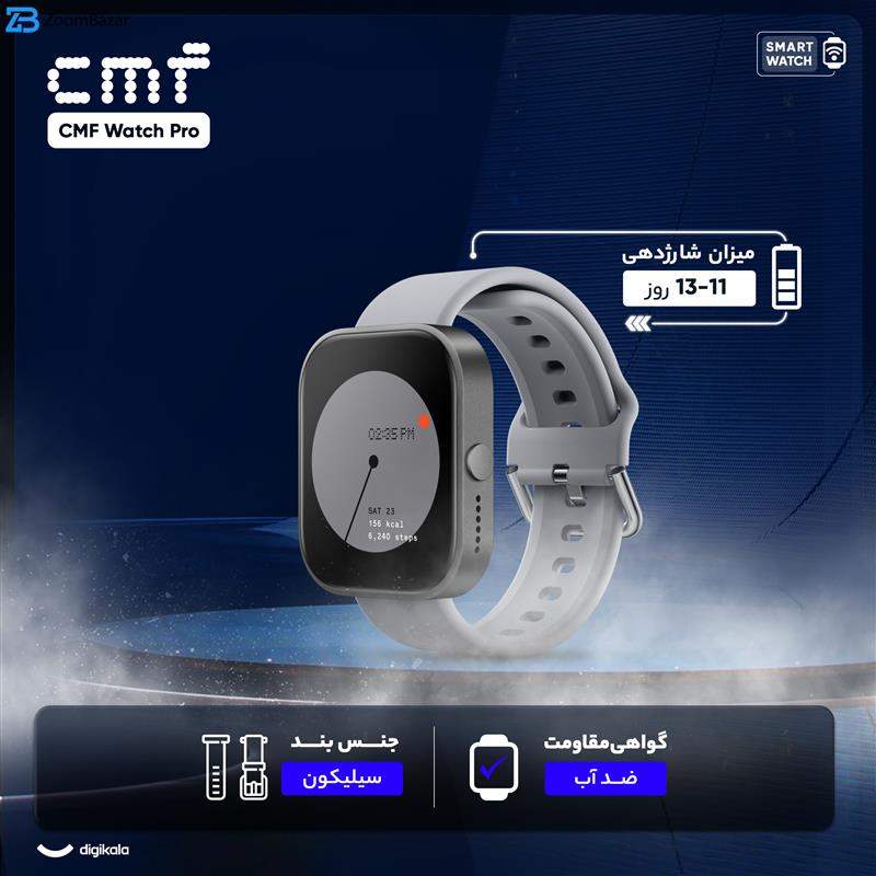 ساعت هوشمند CMF Watch Pro از برند ناتینگ، طراحی مدرن و عملکرد پیشرفته‌ای دارد. این ساعت برای آقایان و بانوانی که به دنبال یک ابزار کارآمد برای استفاده روزمره، رسمی و ورزشی هستند، انتخابی ایده‌آل محسوب می‌شود. بدنه آلومینیومی باکیفیت و فریم‌های متنوع رنگی از جمله نقره‌ای، خاکستری و نارنجی، زیبایی خاصی به این محصول بخشیده است. بند سیلیکونی آن با قفل سگکی ساده، راحتی و ایمنی را تضمین می‌کند. طراحی ارگونومیک با وزن سبک ۴۷ گرمی، استفاده طولانی ‌مدت از ساعت را بدون ایجاد خستگی ممکن می‌سازد. این ساعت مجهز به نمایشگرAMOLED با اندازه ۱.۹۶ اینچ و رزولوشن ۴۱۰x۵۰۲ پیکسل است. تراکم پیکسلی ۳۳۲ پیکسل بر اینچ و روشنایی بالای ۶۰۰+ نیت، کیفیت تصویر فوق‌العاده‌ای ارائه می‌دهد. نمایشگر بزرگ و شفاف، تجربه کاربری لذت‌بخشی برای مشاهده اعلان‌ها، ورزش‌ها و اطلاعات دیگر فراهم می‌کند. ساعت CMF Watch Pro با بلوتوث نسخه ۵.۳ ارتباط پایدار و سریع با گوشی‌های هوشمند برقرار می‌کند. این ساعت با سیستم‌عامل‌های iOS 13 و Android 8.0 یا جدیدتر سازگار است. ویژگی‌هایی مانند پشتیبانی از GPS و فناوری‌های جهت‌یابی، امکان پیگیری دقیق مسیرهای ورزشی را برای کاربران فراهم کرده است. این ساعت با حسگرهای پیشرفته، امکان پایش ضربان قلب، سنجش اکسیژن خون و بیش از ۱۰۰ حالت ورزشی را فراهم کرده است. باتری ۳۴۰ میلی‌آمپر ساعتی این ساعت با یک ‌بار شارژ تا ۱۳ روز شارژدهی دارد.. این ساعت با ویژگی‌های منحصر ‌به ‌فرد و قیمت مناسب، انتخاب مناسبی برای تمام سلیقه‌ها است.