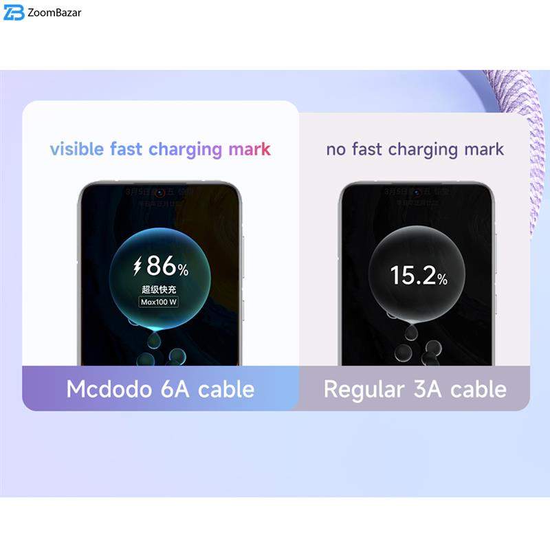 کابل USB به USB-C مک دودو مدل CA-3650 طول 1.2 متر دارای روکش سوکت های کریستالی مقاوم و شکیل میباشد.کابل مک دودو تایپ سی از شارژ سریع و فناوری های Huawei SCP,Samsung AFC,OPPO VOOC ,QC4.0/0.3 پشتیبانی مینماید و قابلیت انتقال دیتا با سرعت 480 مگابیت بر ثانیه را دارد.این کابل توان حداکثر شارژ 100 واتی با پشتیبانی از 6 آمپر را داراست.این کابل با روکش کنفی PVC و نایلون بسیار مقاوم و با مغزی تمام مس قابلیت بالای انتقال شارژ و جریان را داراست.از محاسن این کابل کارایی با اکثر برند های موبایل و پشتیبانی از فست شارژ آنهاست.