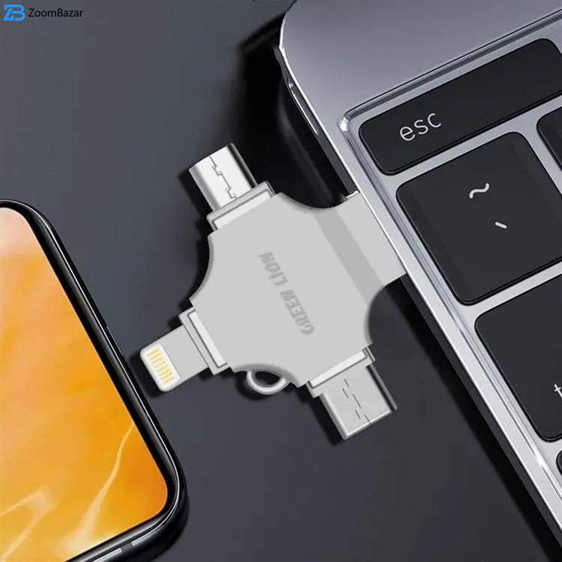 فلش مموری چندکاره گرین با ظاهری فلزی و شیک ، کاملا هوشمندانه طراحی شده است . در عصر فناوری امروز ، اغلب فضای ذخیره سازی در نظر گرفته شده برای دستگاه شما کافی نمی‌باشد و باید برای ذخیره سازی اطلاعات خود از فضاهای اضافه نیز کمک بگیرید .ابعاد کوچک این فلش به شما این امکان را می‌دهد که آن را به راحتی در کیف یا جیب خود قرار دهید و اطلاعاتتان را همراه با خود حمل کنید . دارای 4 ورودی – خروجی Lightning ، USB-A ، USB-C و Micro USB است که با همه‌ی دستگاه‌های اندروید و ios و ویندوز سازگاری دارد .این فلش مموری با همه‌ی فرمت‌های صوتی و تصویری سازگار است . بنابراین همیشه می‌توانید از دانلود موزیک و فیلم مورد علاقه‌ی خود لذت ببرید و نگرانی بابت تمام شدن حافظه موبایل ، تبلت ، دوربین یا لپ‌تاپ خود نداشته باشید .کاربری ساده و آسانی دارد و بدون پیکربندی قبلی ، می‌توانید از سرعت انتقال سریع آن استفاده کنید .
