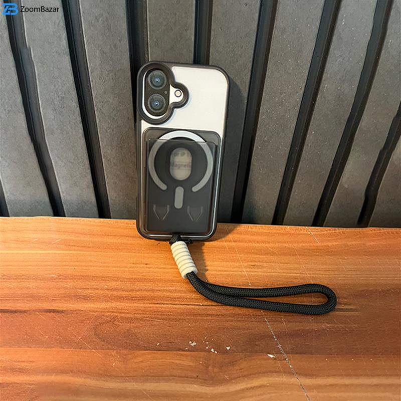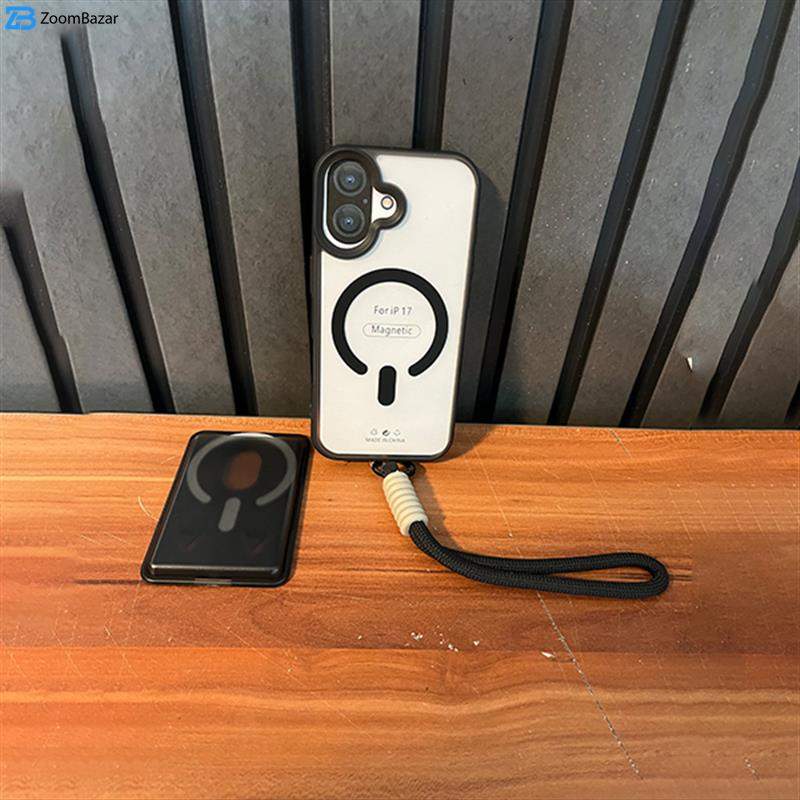 در قسمت پشتی قاب، حلقه‌ی مگنتی قدرتمند تعبیه شده که با فناوری MagSafe اپل سازگار است. این ویژگی به شما امکان می‌دهد تا گوشی خود را به‌صورت مغناطیسی و کاملاً ایمن به شارژرهای بی‌سیم، پایه‌های نگهدارنده خودرو یا استندهای رومیزی متصل کنید. مگنت داخلی قوی باعث می‌شود اتصال پایدار و بدون لغزش برقرار شده و تجربه‌ای راحت و مطمئن از شارژ یا استفاده روزمره داشته باشید.