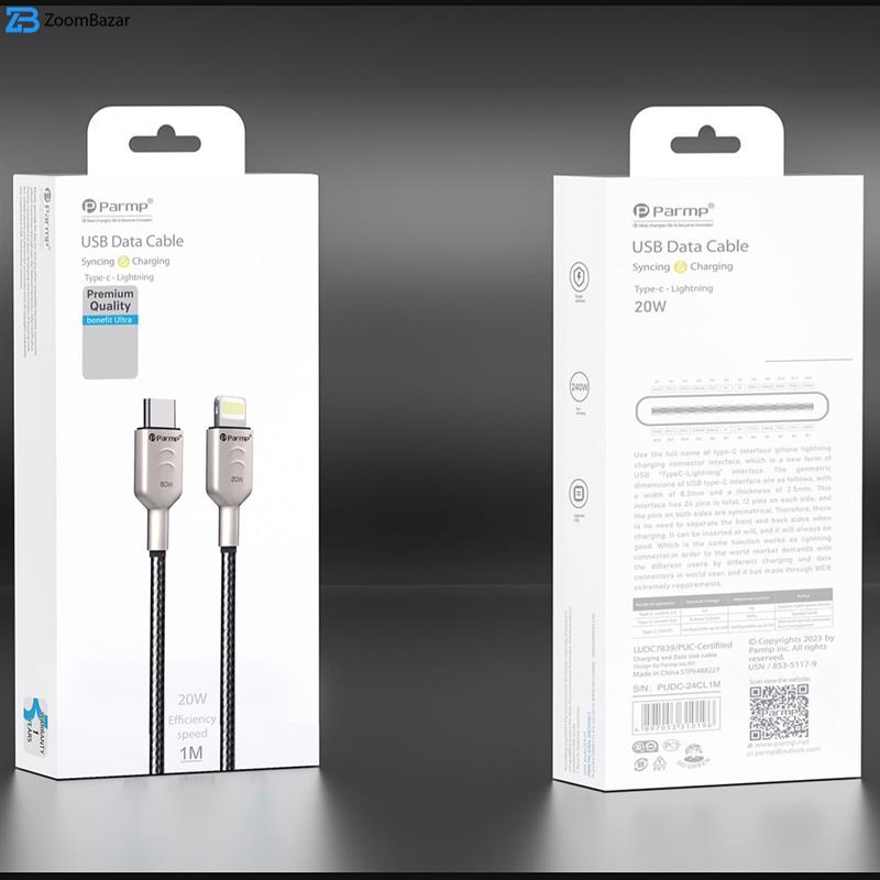 کابل پارمپ PUDC-24CL1M 20W از طول 100 سانتی‌متری برخوردار است و روکشی از نایلون بافته شده اطراف آن را احاطه کرده است که در برابر پارگی و آسیب بسیار مقاوم عمل می‌کند. کانکتورهای آن به رنگ نقره‌ای و از آلیاژ روی بوده و ضداکسیداسیون و ضد ضربه بودن از ویژگی‌های آن است. برای استحکام و افزایش عمر مفید آن هم محافظی برای قسمت اتصال کابل به کانکتور درنظر گرفته شده است تا در برابر خم‌شدن‌های مکرر آسیبی نبیند. پارمپ با تولید این کابل با طول 100 سانتی متری و توان 20 وات به کاربران خود کمک کرده که کابلی با سرعت بالا را همیشه با خود همراه داشته باشند و طول یک متری آن نیازهای روزانه را برطرف کرده و با اتصال به پاوربانک می توانید در هر مکانی به شارژ گوشی خود بپردازند.