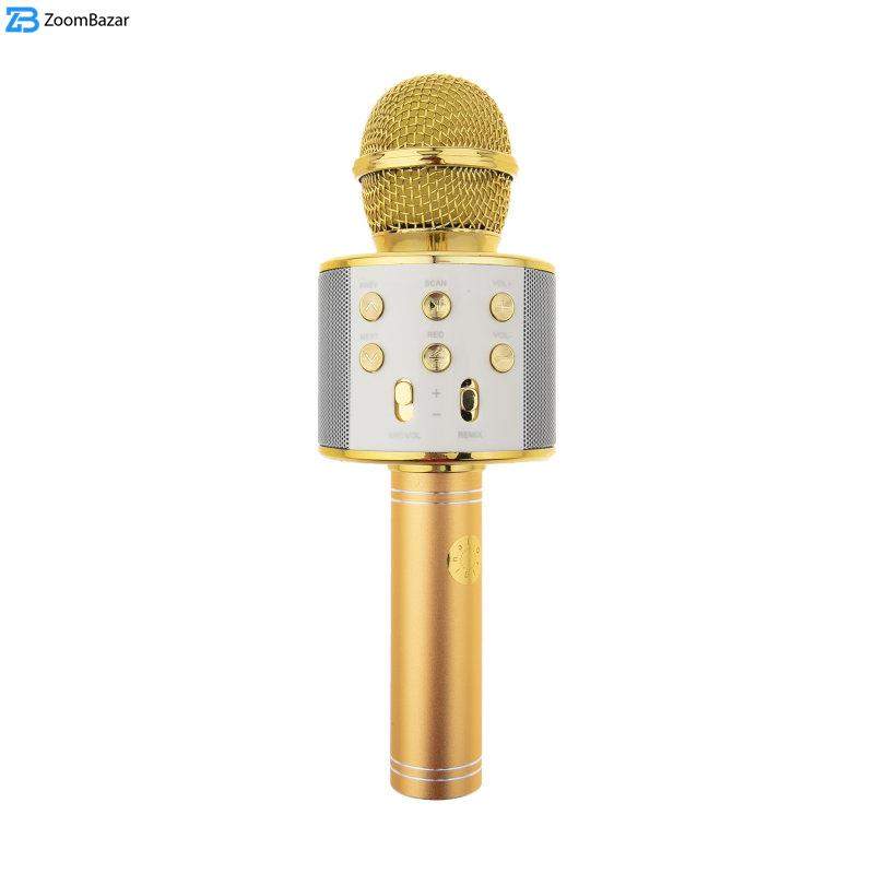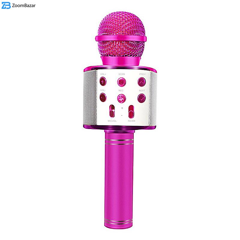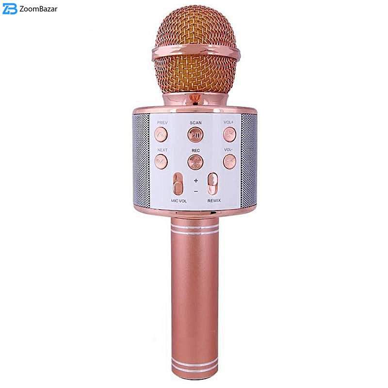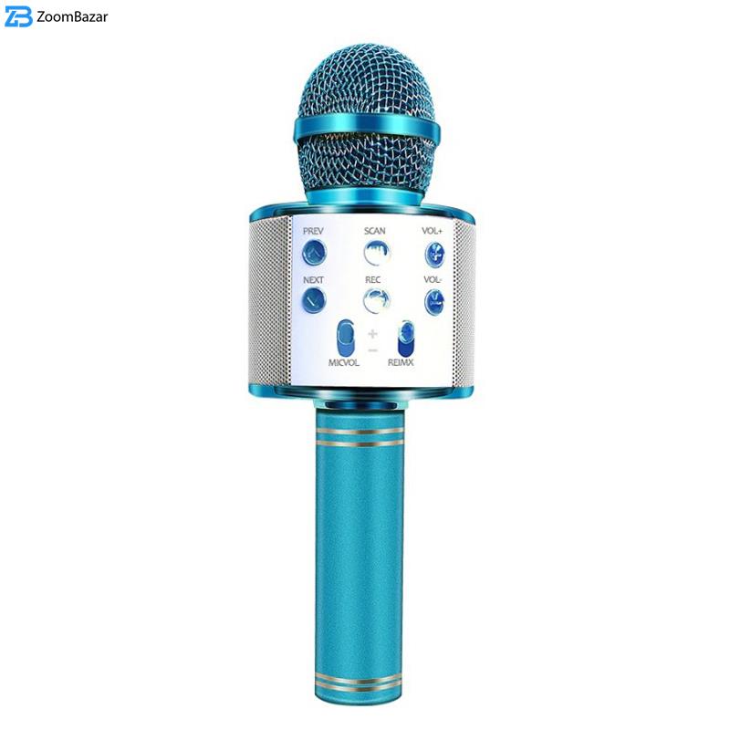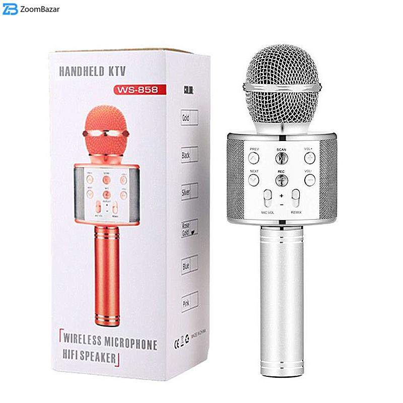 میکروفون اسپیکر مدل WS-858 یک میکروفون همه کاره با قابلیت اتصال بی سیم (بلوتوثی) می باشد. این دستگاه از جنس بهترین مواد ABS و آلومینیوم ساخته شده است . به طور خلاصه می توان امکانات این میکروفون را به این صورت نام برد: بلوتوث ورودی حافظه فلش یا USB ، شیار مخصوص به کارت حافظه، دارای پورت AUX، باتری لیتیومی قابل شارژ ، دکمه های تنظیم صدا