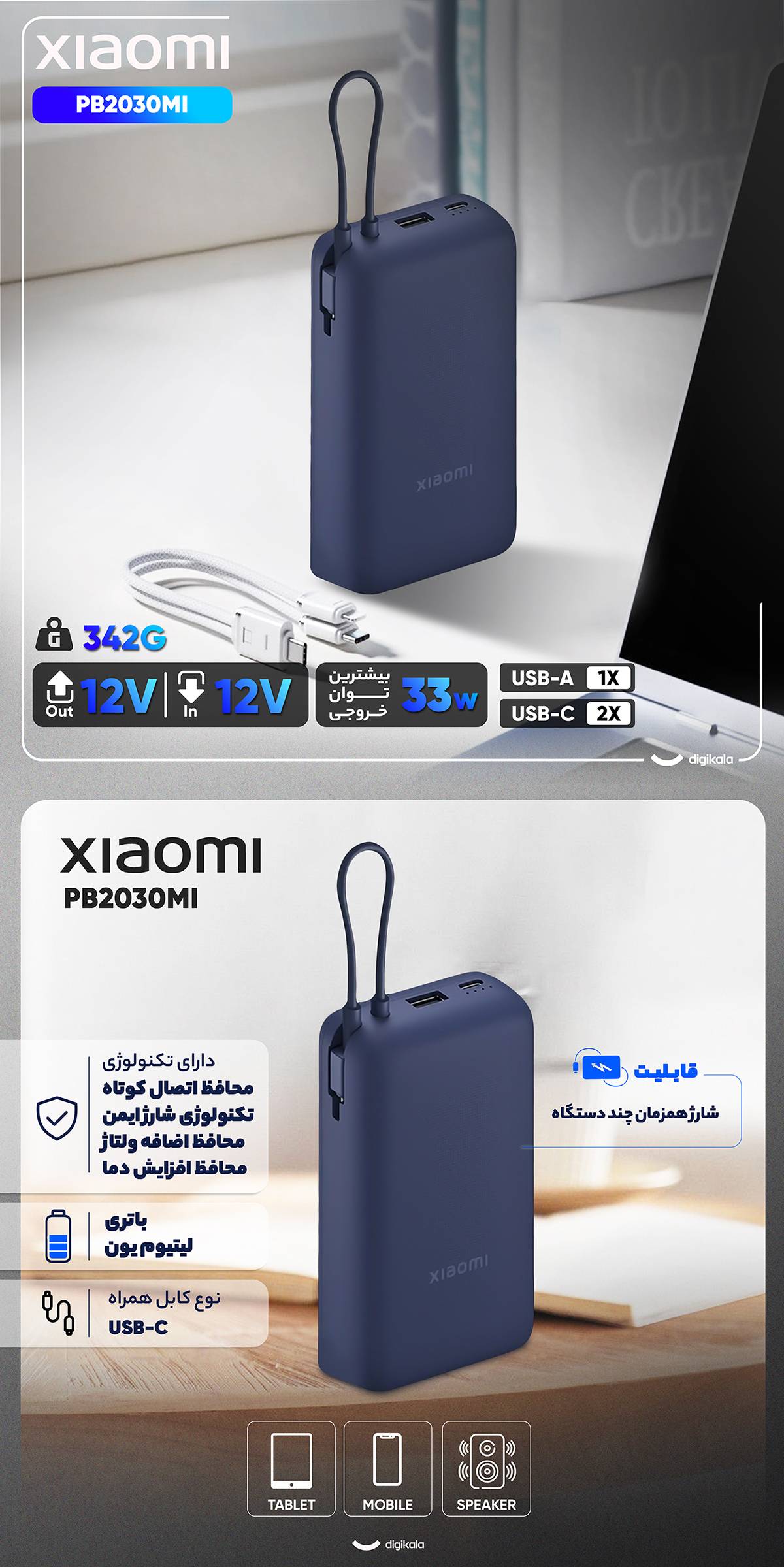 پاوربانک PB2030MI یکی از جدیدترین محصولات شیائومی در رده پاوربانک‌های پرقدرت و سریع است که با توان خروجی ۳۳ وات، ظرفیت بالا و طراحی کاربرپسند، جایگاه ویژه‌ای در میان شارژرهای همراه میان‌رده و حرفه‌ای پیدا کرده است. این مدل با بهره‌گیری از فناوری‌های شارژ سریع PD و QC، قابلیت شارژ همزمان سه دستگاه و باتری قدرتمند لیتیوم یونی، به گونه‌ای طراحی شده که نیاز کاربران مدرن را در تمامی شرایط، از استفاده روزمره گرفته تا سفرهای طولانی، پاسخ دهد.